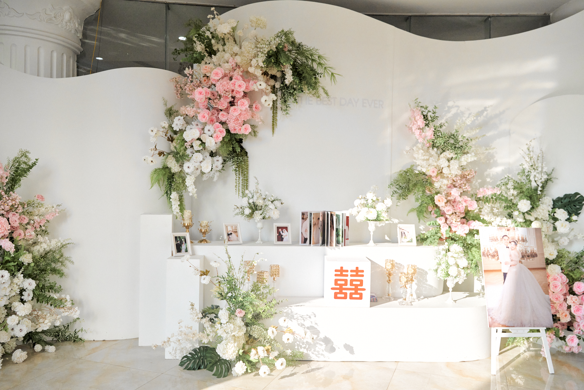 Trang trí tiêu chuẩn trung tâm: Cổng hoa lụa – Backdrop chụp hình có khắc chữ theo tông màu